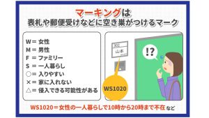 お知らせ 投稿日:2025-10-14 10月以降は「空き巣」が増える??? 長時間・長期間の留守が増える 秋は行楽シーズンであり、旅行やアウトドア、運動会などで家を空ける機会が増えるため、空き巣に狙われやすくなる傾向が!! 特に「戸建」でのポストやインターフォンに”目印”(見かけない)があればご注意くださいね! ※画像は参考資料です。 -お知らせ